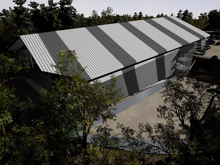 The hipped ends of the form are left recessive and dark, with purlins vertical and regular.