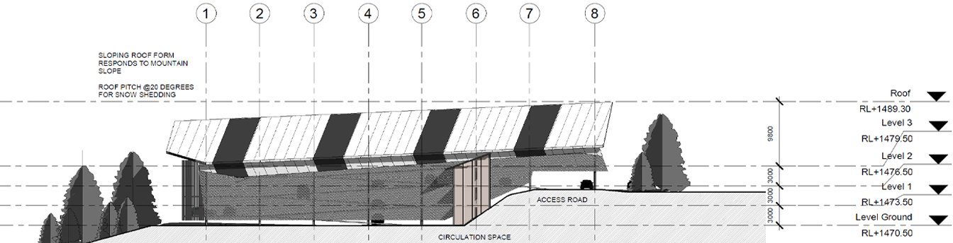 Dynamic bands of soft grey help to reduce the scale of the building, and by being angled across the façade, provide a dynamic and exciting form that will stimulate the visitors to the mountain.