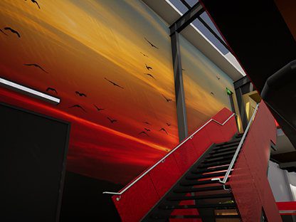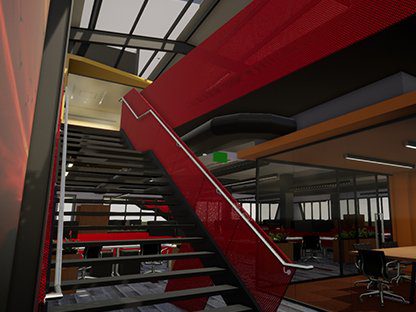 The interior architecture of the building celebrates the engineering backbone, showcasing the structure and building services in an industrially inspired aesthetic. Each level is characterised with an environmental scene from which a strong defining colour creates a distinct and unique identity within the grounds of a very large organisation.
