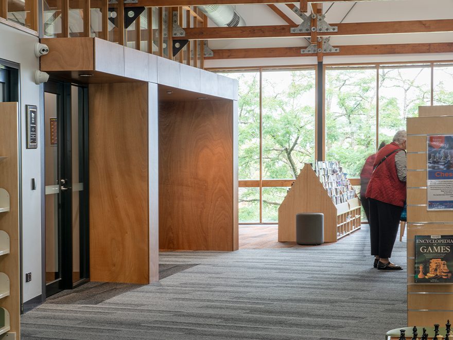 Flexibility is key, with a clear floor plan enabling freedom of layout below, with dedicated spaces contained in a single spine along one side of the library