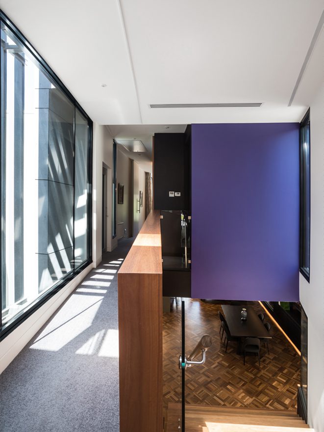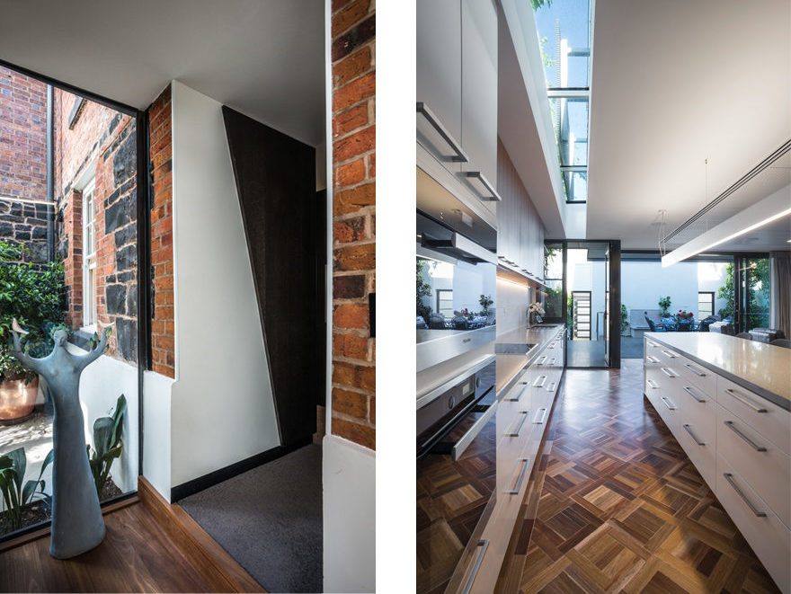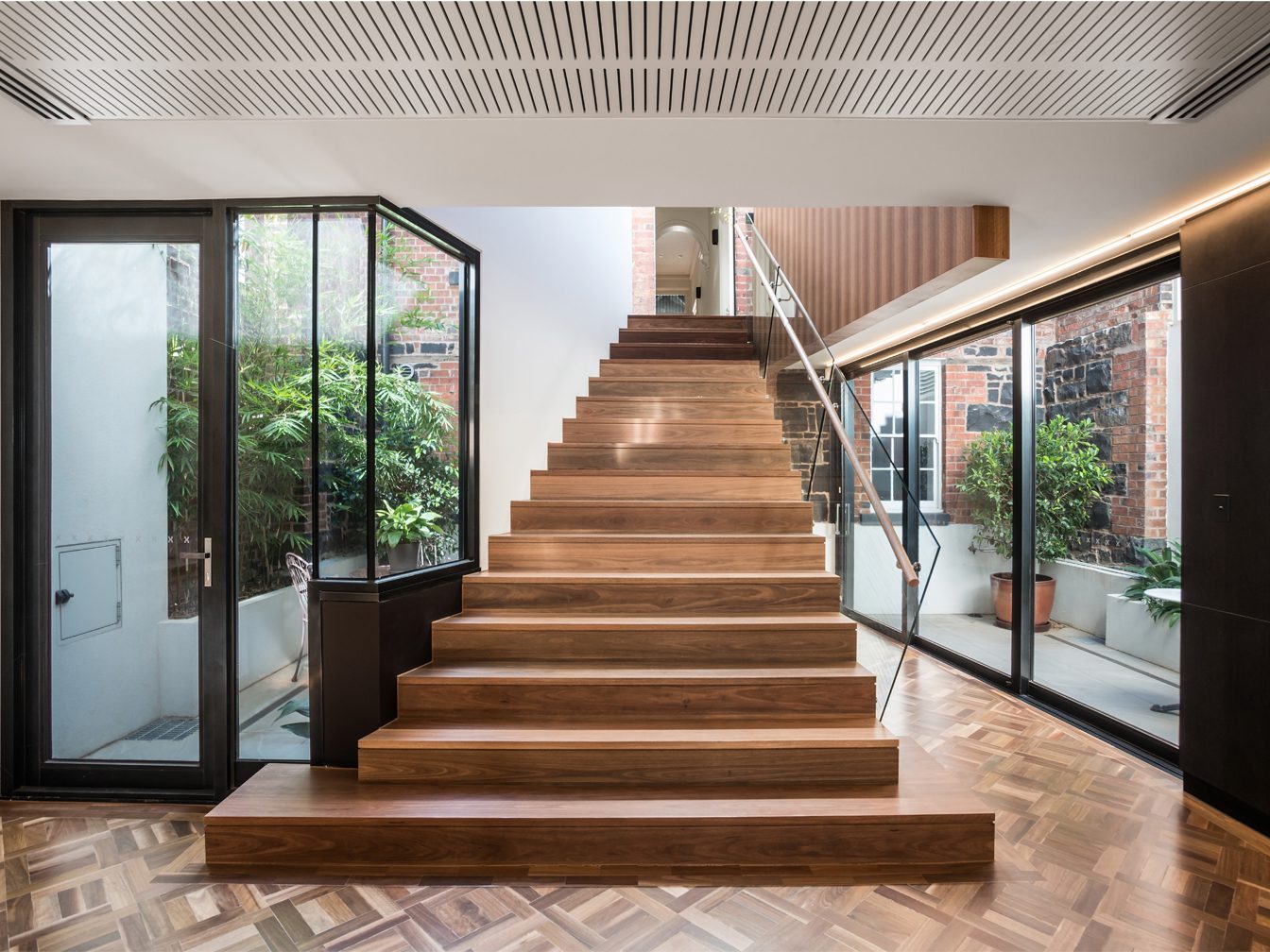 The deep floor plan is punctuated with two internal courtyards that separate the levels and eras, with new works respectfully detached from the textural brick façade of the past. A glass link seamlessly connects old to new, with a bridge and dramatic stair linking the traditional and the contemporary, both physically and spiritually.