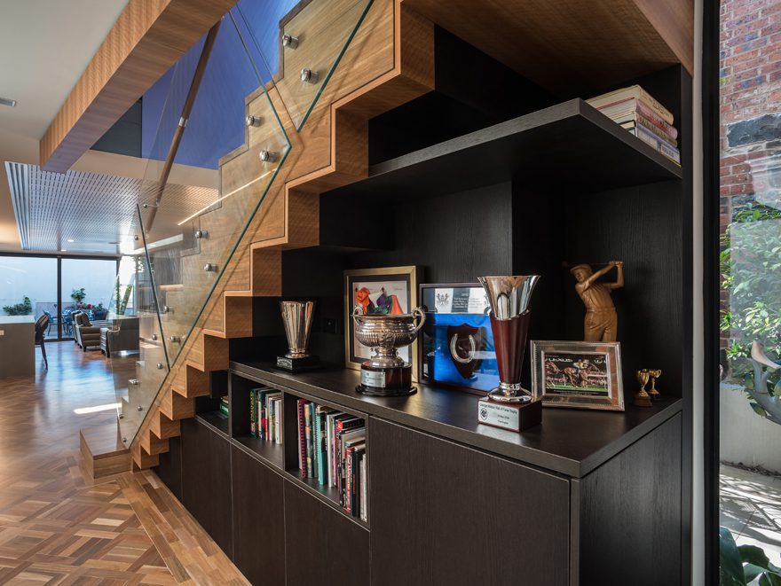 Carefully considered joinery helps the clients navigate through their daily life. A large built-in unit adorns the main living space and accommodates all the necessary modern conveniences – AV, fire place and general storage. Beneath the staircase provided another opportunity for the display of racing memorabilia and convenient yet discrete charging points for technology.