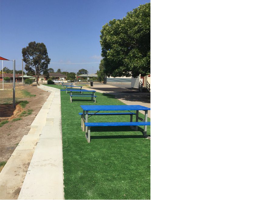 The new terracing along the oval edge creates an exciting presentation to the sports ground whilst providing a new platform for spectator viewing with easy and safe access to the oval.  The adjacent underutilised space along the oval edge has been transformed into a flexible outdoor learning area for small and large groups. This area adjacent to the terracing has been dressed with synthetic turf and existing refurbished seating and tables.
