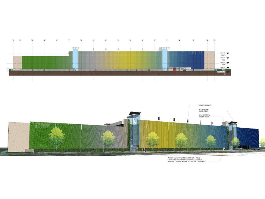- A green landscape façade using simple zinc purlins at approximately $2 m less than the provided design