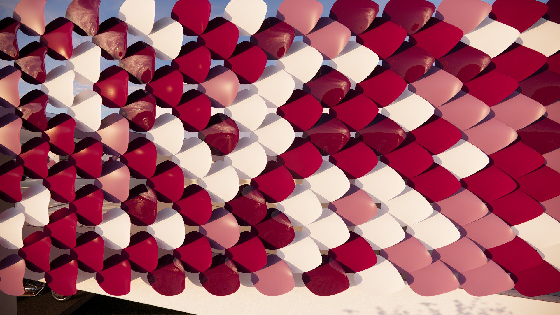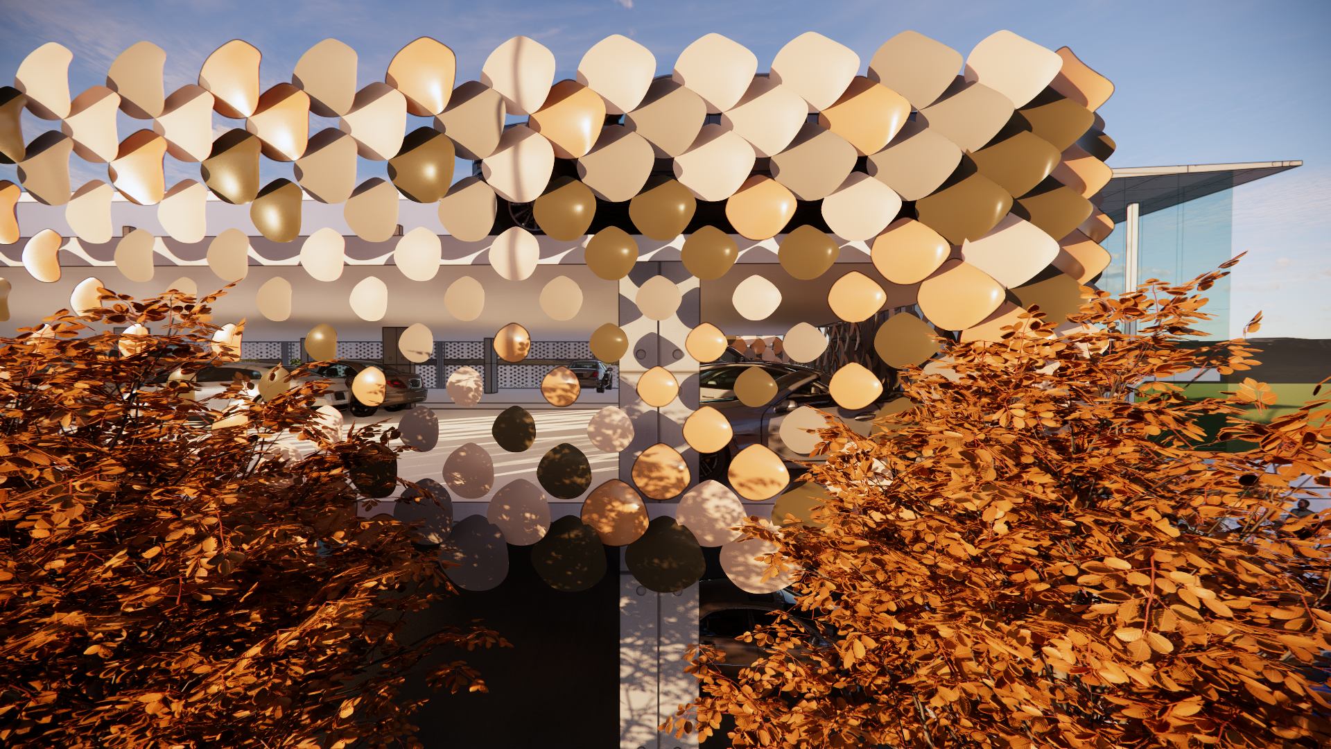 Adjacent to the rose garden, the multi coloured panels pick up on the Rose Garden colours providing a strong unifying gateway statement.  At the other end opposite the civic centre, the petal colours reference the civic building timber tones and hues, as well as the street trees in Autumn.  Together this provides 2 strong visual bookends that successfully disguise the humble carpark function and ensure it is a strong design contributor to the urban fabric of the city.