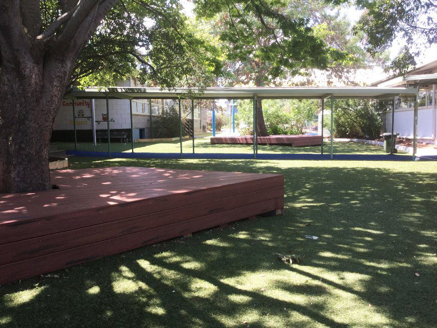 This is achieved through the introduction of coloured synthetic turf, raised timber platform surrounds two trees utilising durable and low-maintenance solutions.