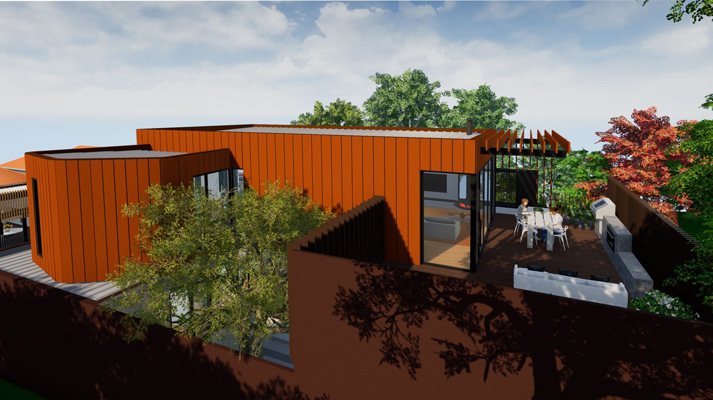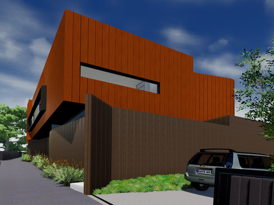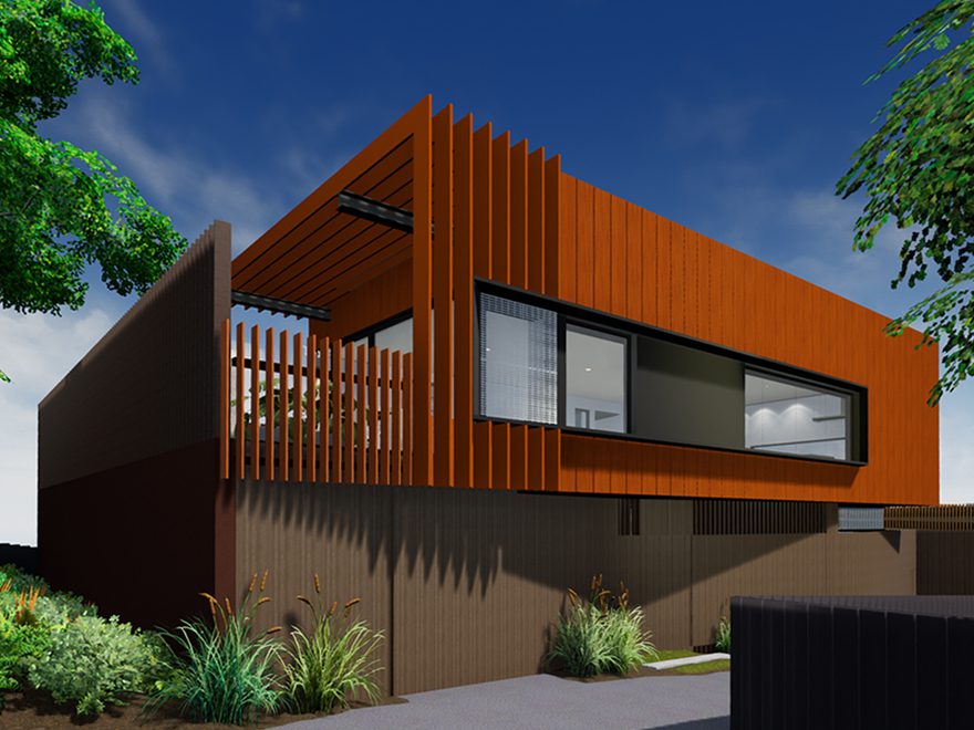 The upper level is clad in core ten steel, expressed as a floating box over the delicate timber battens below.