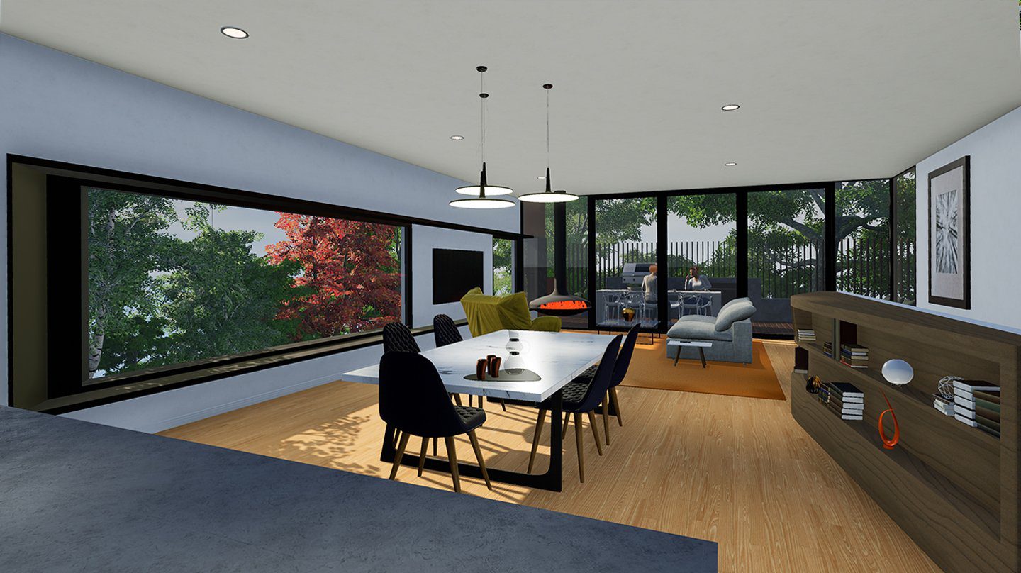 An elegant suspended fireplace commands the living area, that is shaded from the north sun by extended fins of core ten steel.