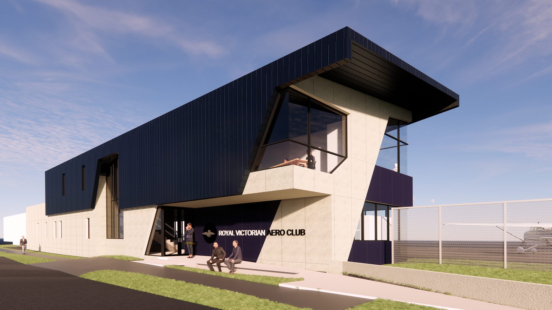 The new building for RVAC will be a focal point for flight training and enthusiasts at the Moorabbin Airport. Replacing the tired worn timber building and portables will be a slick, noble pavilion over 2 levels. Expressed architecturally as 2 slipping forms, a raised blue metallic fuselage glides over the glass and panelled base below. Ideas about flight and craft are evident, expressing movement and elegant poise above the ground.