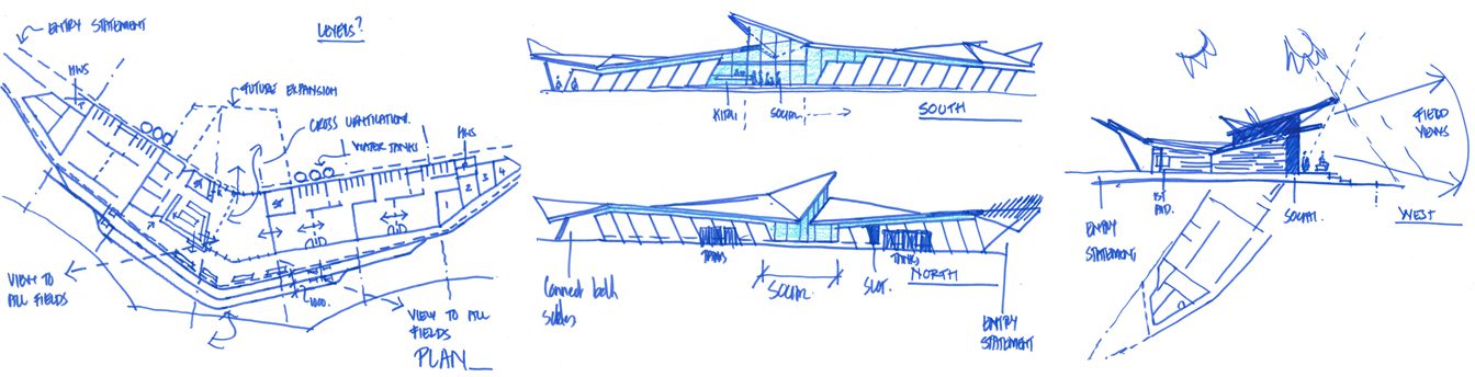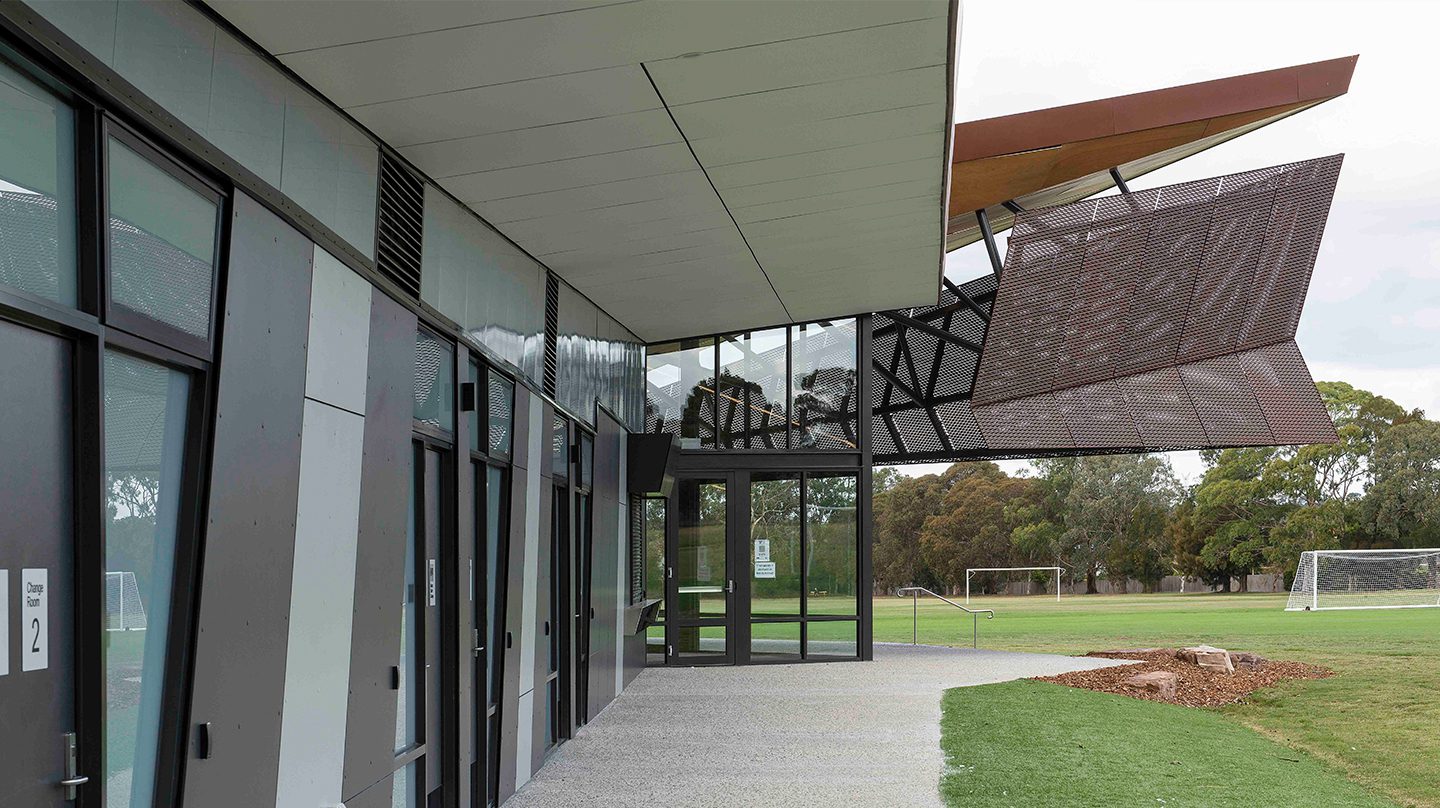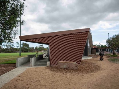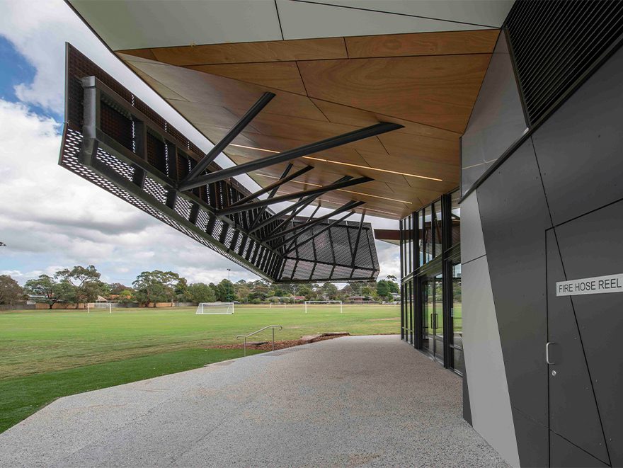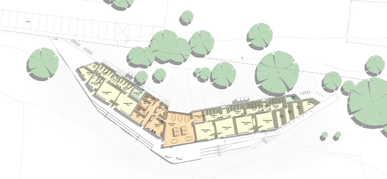 The building is sited safely out of the main flood zone to be elevated over the sports fields. Support spaces are aligned on either side of the multipurpose space, with the possibility of future expansion to the north envisaged and encouraged with a second entry point from the north, thereby proving a strong activation and welcoming connection to the community side of the reserve.
