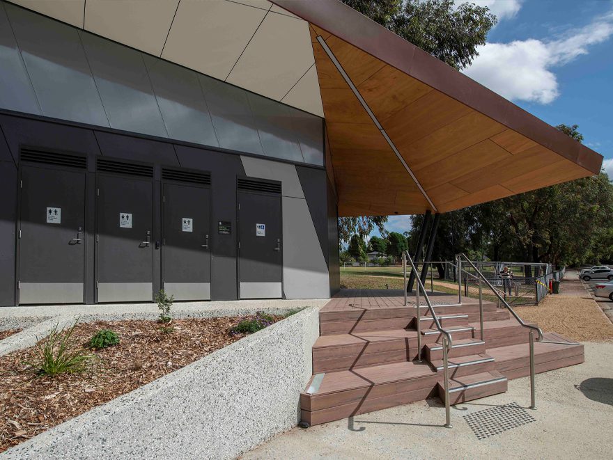 It is shaped expressively in response to its context and sensitive surrounding trees, with thin ends enabling easy circulation around the form and providing excellent response to CPTED. In this way it is an integrated part of the entire park.
