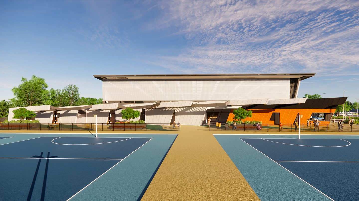 The new pavilion and indoor sporting hall form a focal point within the precinct centred around a new community forecourt.