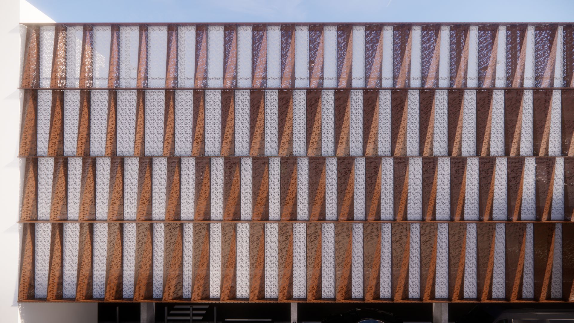 The facade features a parametric design, inspired by the Council motto “ A new energy”. Varied scales of triangulated perforated sheets provide a pulse effect across the façade, as a way of expressing energy.